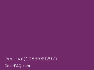 Decimal 1083639297 Color is a dark magenta color and the nearest color is Byzantium #702963. Hex code #712969 and RGB value is rgb(113,41,105). In RGB color space, this color is composed of 44% red, 16% green, 41% blue, In CMYK color space, this color is composed of 0% cyan, 64% magenta, 7% yellow , 56% black , In HSL color space, this color has a hue angle of 307° , 47% saturation and 30% lightness.