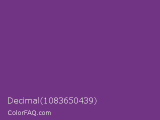 Decimal 1083650439 Color is a normal purple color and the nearest color is Maximum Purple #733380. Hex code #713383 and RGB value is rgb(113,51,131). In RGB color space, this color is composed of 44% red, 20% green, 51% blue, In CMYK color space, this color is composed of 14% cyan, 61% magenta, 0% yellow , 49% black , In HSL color space, this color has a hue angle of 287° , 44% saturation and 36% lightness.