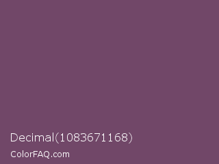 Decimal 1083671168 Color is a normal magenta color and the nearest color is Cosmic #76395d. Hex code #714768 and RGB value is rgb(113,71,104). In RGB color space, this color is composed of 44% red, 28% green, 41% blue, In CMYK color space, this color is composed of 0% cyan, 37% magenta, 8% yellow , 56% black , In HSL color space, this color has a hue angle of 313° , 23% saturation and 36% lightness.