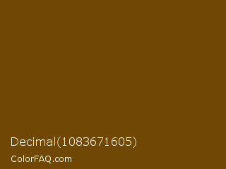 Decimal 1083671605 Color is a dark orange color and the nearest color is Antique Bronze #704a07. Hex code #714803 and RGB value is rgb(113,72,3). In RGB color space, this color is composed of 44% red, 28% green, 1% blue, In CMYK color space, this color is composed of 0% cyan, 36% magenta, 97% yellow , 56% black , In HSL color space, this color has a hue angle of 38° , 95% saturation and 23% lightness.