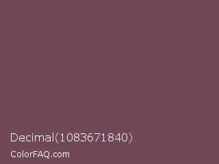 Decimal 1083671840 Color is a normal rose color and the nearest color is Ferra #704f50. Hex code #714858 and RGB value is rgb(113,72,88). In RGB color space, this color is composed of 44% red, 28% green, 35% blue, In CMYK color space, this color is composed of 0% cyan, 36% magenta, 22% yellow , 56% black , In HSL color space, this color has a hue angle of 337° , 22% saturation and 36% lightness.