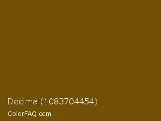 Decimal 1083704454 Color is a dark orange color and the nearest color is Antique Bronze #704a07. Hex code #715006 and RGB value is rgb(113,80,6). In RGB color space, this color is composed of 44% red, 31% green, 2% blue, In CMYK color space, this color is composed of 0% cyan, 29% magenta, 95% yellow , 56% black , In HSL color space, this color has a hue angle of 41° , 90% saturation and 23% lightness.