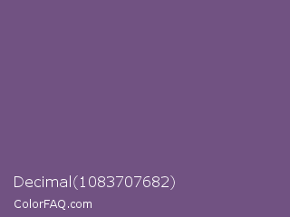 Decimal 1083707682 Color is a normal purple color and the nearest color is Dark Lavender #734f96. Hex code #715282 and RGB value is rgb(113,82,130). In RGB color space, this color is composed of 44% red, 32% green, 51% blue, In CMYK color space, this color is composed of 13% cyan, 37% magenta, 0% yellow , 49% black , In HSL color space, this color has a hue angle of 279° , 23% saturation and 42% lightness.