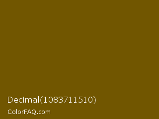 Decimal 1083711510 Color is a very dark yellow color and the nearest color is Antique Bronze #704a07. Hex code #715600 and RGB value is rgb(113,86,0). In RGB color space, this color is composed of 44% red, 34% green, 0% blue, In CMYK color space, this color is composed of 0% cyan, 24% magenta, 100% yellow , 56% black , In HSL color space, this color has a hue angle of 46° , 100% saturation and 22% lightness.