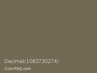Decimal 1083730274 Color is a normal orange color and the nearest color is Peat #716b56. Hex code #716952 and RGB value is rgb(113,105,82). In RGB color space, this color is composed of 44% red, 41% green, 32% blue, In CMYK color space, this color is composed of 0% cyan, 7% magenta, 27% yellow , 56% black , In HSL color space, this color has a hue angle of 45° , 16% saturation and 38% lightness.
