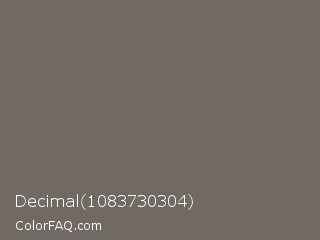 Decimal 1083730304 Color is a normal orange color and the nearest color is Flint #6f6a61. Hex code #716964 and RGB value is rgb(113,105,100). In RGB color space, this color is composed of 44% red, 41% green, 39% blue, In CMYK color space, this color is composed of 0% cyan, 7% magenta, 12% yellow , 56% black , In HSL color space, this color has a hue angle of 23° , 6% saturation and 42% lightness.