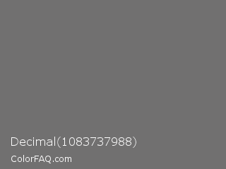 Decimal 1083737988 Color is a normal red color and the nearest color is Nickel #727472. Hex code #717070 and RGB value is rgb(113,112,112). In RGB color space, this color is composed of 44% red, 44% green, 44% blue, In CMYK color space, this color is composed of 0% cyan, 1% magenta, 1% yellow , 56% black , In HSL color space, this color has a hue angle of 0° , 0% saturation and 44% lightness.