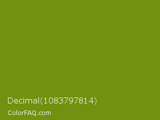 Decimal 1083797814 Color is a normal lime color and the nearest color is Trendy Green #7c881a. Hex code #719110 and RGB value is rgb(113,145,16). In RGB color space, this color is composed of 44% red, 57% green, 6% blue, In CMYK color space, this color is composed of 22% cyan, 0% magenta, 89% yellow , 43% black , In HSL color space, this color has a hue angle of 75° , 80% saturation and 32% lightness.