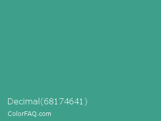 Decimal 68174641 Color is a normal cyan color and the nearest color is Zomp #39a78e. Hex code #3ea08b and RGB value is rgb(62,160,139). In RGB color space, this color is composed of 24% red, 63% green, 55% blue, In CMYK color space, this color is composed of 61% cyan, 0% magenta, 13% yellow , 37% black , In HSL color space, this color has a hue angle of 167° , 44% saturation and 44% lightness.
