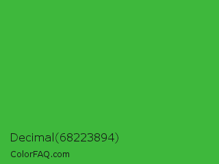 Decimal 68223894 Color is a normal green color and the nearest color is Wageningen Green #34b233. Hex code #3eb83c and RGB value is rgb(62,184,60). In RGB color space, this color is composed of 24% red, 72% green, 24% blue, In CMYK color space, this color is composed of 66% cyan, 0% magenta, 67% yellow , 28% black , In HSL color space, this color has a hue angle of 119° , 51% saturation and 48% lightness.