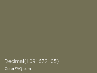 Decimal 1091672105 Color is a normal yellow color and the nearest color is Crocodile #736d58. Hex code #737055 and RGB value is rgb(115,112,85). In RGB color space, this color is composed of 45% red, 44% green, 33% blue, In CMYK color space, this color is composed of 0% cyan, 3% magenta, 26% yellow , 55% black , In HSL color space, this color has a hue angle of 54° , 15% saturation and 39% lightness.