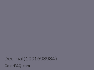 Decimal 1091698984 Color is a normal indigo color and the nearest color is Storm Gray #717486. Hex code #737180 and RGB value is rgb(115,113,128). In RGB color space, this color is composed of 45% red, 44% green, 50% blue, In CMYK color space, this color is composed of 10% cyan, 12% magenta, 0% yellow , 50% black , In HSL color space, this color has a hue angle of 248° , 6% saturation and 47% lightness.