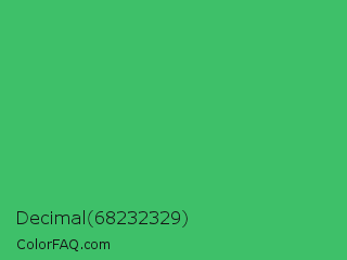Decimal 68232329 Color is a normal green color and the nearest color is Medium Sea Green #3cb371. Hex code #3ec069 and RGB value is rgb(62,192,105). In RGB color space, this color is composed of 24% red, 75% green, 41% blue, In CMYK color space, this color is composed of 68% cyan, 0% magenta, 45% yellow , 25% black , In HSL color space, this color has a hue angle of 140° , 51% saturation and 50% lightness.