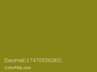 Decimal 17470539283 Color is a normal yellow color and the nearest color is Trendy Green #7c881a. Hex code #878515 and RGB value is rgb(135,133,21). In RGB color space, this color is composed of 53% red, 52% green, 8% blue, In CMYK color space, this color is composed of 0% cyan, 1% magenta, 84% yellow , 47% black , In HSL color space, this color has a hue angle of 59° , 73% saturation and 31% lightness.