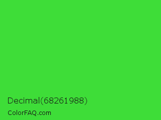 Decimal 68261988 Color is a normal green color and the nearest color is Lime Green #32cd32. Hex code #3edd38 and RGB value is rgb(62,221,56). In RGB color space, this color is composed of 24% red, 87% green, 22% blue, In CMYK color space, this color is composed of 72% cyan, 0% magenta, 75% yellow , 13% black , In HSL color space, this color has a hue angle of 118° , 71% saturation and 54% lightness.