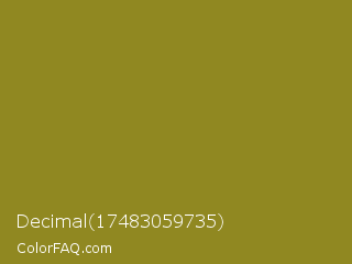 Decimal 17483059735 Color is a normal yellow color and the nearest color is Hacienda #98811b. Hex code #908821 and RGB value is rgb(144,136,33). In RGB color space, this color is composed of 56% red, 53% green, 13% blue, In CMYK color space, this color is composed of 0% cyan, 6% magenta, 77% yellow , 44% black , In HSL color space, this color has a hue angle of 56° , 63% saturation and 35% lightness.