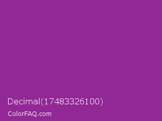 Decimal 17483326100 Color is a normal magenta color and the nearest color is Vivid Violet #803790. Hex code #912896 and RGB value is rgb(145,40,150). In RGB color space, this color is composed of 57% red, 16% green, 59% blue, In CMYK color space, this color is composed of 3% cyan, 73% magenta, 0% yellow , 41% black , In HSL color space, this color has a hue angle of 297° , 58% saturation and 37% lightness.