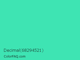 Decimal 68294521 Color is a normal green color and the nearest color is Eucalyptus #44d7a8. Hex code #3ee4b3 and RGB value is rgb(62,228,179). In RGB color space, this color is composed of 24% red, 89% green, 70% blue, In CMYK color space, this color is composed of 73% cyan, 0% magenta, 21% yellow , 11% black , In HSL color space, this color has a hue angle of 162° , 75% saturation and 57% lightness.