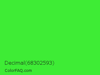 Decimal 68302593 Color is a normal green color and the nearest color is Lime Green #32cd32. Hex code #3eec35 and RGB value is rgb(62,236,53). In RGB color space, this color is composed of 24% red, 93% green, 21% blue, In CMYK color space, this color is composed of 74% cyan, 0% magenta, 78% yellow , 7% black , In HSL color space, this color has a hue angle of 117° , 83% saturation and 57% lightness.
