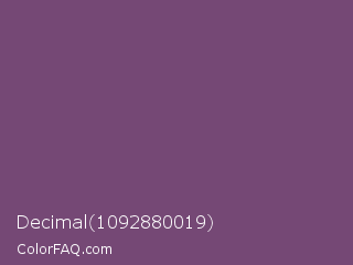 Decimal 1092880019 Color is a normal magenta color and the nearest color is Twilight Lavender #8a496b. Hex code #754875 and RGB value is rgb(117,72,117). In RGB color space, this color is composed of 46% red, 28% green, 46% blue, In CMYK color space, this color is composed of 0% cyan, 38% magenta, 0% yellow , 54% black , In HSL color space, this color has a hue angle of 300° , 24% saturation and 37% lightness.