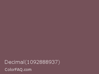 Decimal 1092888937 Color is a normal red color and the nearest color is Russett #755a57. Hex code #755159 and RGB value is rgb(117,81,89). In RGB color space, this color is composed of 46% red, 32% green, 35% blue, In CMYK color space, this color is composed of 0% cyan, 31% magenta, 24% yellow , 54% black , In HSL color space, this color has a hue angle of 347° , 18% saturation and 39% lightness.