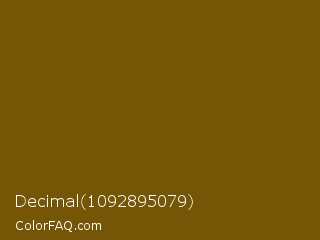 Decimal 1092895079 Color is a dark orange color and the nearest color is Antique Bronze #704a07. Hex code #755607 and RGB value is rgb(117,86,7). In RGB color space, this color is composed of 46% red, 34% green, 3% blue, In CMYK color space, this color is composed of 0% cyan, 26% magenta, 94% yellow , 54% black , In HSL color space, this color has a hue angle of 43° , 89% saturation and 24% lightness.