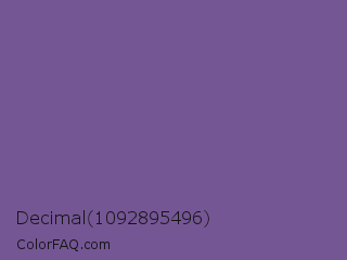 Decimal 1092895496 Color is a normal violet color and the nearest color is Dark Lavender #734f96. Hex code #755694 and RGB value is rgb(117,86,148). In RGB color space, this color is composed of 46% red, 34% green, 58% blue, In CMYK color space, this color is composed of 21% cyan, 42% magenta, 0% yellow , 42% black , In HSL color space, this color has a hue angle of 270° , 26% saturation and 46% lightness.