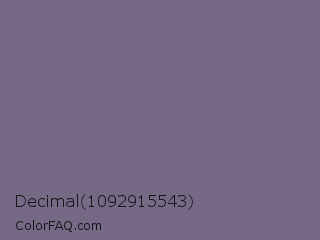 Decimal 1092915543 Color is a normal violet color and the nearest color is Rum #796989. Hex code #756985 and RGB value is rgb(117,105,133). In RGB color space, this color is composed of 46% red, 41% green, 52% blue, In CMYK color space, this color is composed of 12% cyan, 21% magenta, 0% yellow , 48% black , In HSL color space, this color has a hue angle of 266° , 12% saturation and 47% lightness.