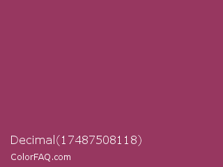 Decimal 17487508118 Color is a normal rose color and the nearest color is Vin Rouge #983d61. Hex code #973760 and RGB value is rgb(151,55,96). In RGB color space, this color is composed of 59% red, 22% green, 38% blue, In CMYK color space, this color is composed of 0% cyan, 64% magenta, 36% yellow , 41% black , In HSL color space, this color has a hue angle of 334° , 47% saturation and 40% lightness.