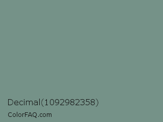 Decimal 1092982358 Color is a normal green color and the nearest color is Blue Smoke #748881. Hex code #759288 and RGB value is rgb(117,146,136). In RGB color space, this color is composed of 46% red, 57% green, 53% blue, In CMYK color space, this color is composed of 20% cyan, 0% magenta, 7% yellow , 43% black , In HSL color space, this color has a hue angle of 159° , 12% saturation and 52% lightness.
