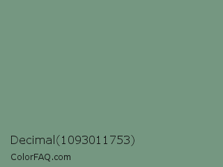 Decimal 1093011753 Color is a normal green color and the nearest color is Oxley #779e86. Hex code #759781 and RGB value is rgb(117,151,129). In RGB color space, this color is composed of 46% red, 59% green, 51% blue, In CMYK color space, this color is composed of 23% cyan, 0% magenta, 15% yellow , 41% black , In HSL color space, this color has a hue angle of 141° , 14% saturation and 53% lightness.