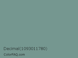 Decimal 1093011780 Color is a normal cyan color and the nearest color is Juniper #6d9292. Hex code #759790 and RGB value is rgb(117,151,144). In RGB color space, this color is composed of 46% red, 59% green, 56% blue, In CMYK color space, this color is composed of 23% cyan, 0% magenta, 5% yellow , 41% black , In HSL color space, this color has a hue angle of 168° , 14% saturation and 53% lightness.