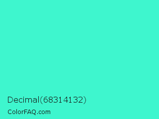Decimal 68314132 Color is a normal cyan color and the nearest color is Turquoise #40e0d0. Hex code #3ef6ce and RGB value is rgb(62,246,206). In RGB color space, this color is composed of 24% red, 96% green, 81% blue, In CMYK color space, this color is composed of 75% cyan, 0% magenta, 16% yellow , 4% black , In HSL color space, this color has a hue angle of 167° , 91% saturation and 60% lightness.