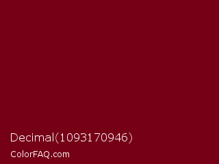 Decimal 1093170946 Color is a dark red color and the nearest color is Venetian Red #72010f. Hex code #760016 and RGB value is rgb(118,0,22). In RGB color space, this color is composed of 46% red, 0% green, 9% blue, In CMYK color space, this color is composed of 0% cyan, 100% magenta, 81% yellow , 54% black , In HSL color space, this color has a hue angle of 349° , 100% saturation and 23% lightness.
