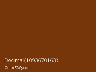 Decimal 1093670163 Color is a dark orange color and the nearest color is Red Beech #7b3801. Hex code #763609 and RGB value is rgb(118,54,9). In RGB color space, this color is composed of 46% red, 21% green, 4% blue, In CMYK color space, this color is composed of 0% cyan, 54% magenta, 92% yellow , 54% black , In HSL color space, this color has a hue angle of 25° , 86% saturation and 25% lightness.