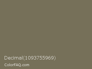 Decimal 1093755969 Color is a normal yellow color and the nearest color is Crocodile #736d58. Hex code #767059 and RGB value is rgb(118,112,89). In RGB color space, this color is composed of 46% red, 44% green, 35% blue, In CMYK color space, this color is composed of 0% cyan, 5% magenta, 25% yellow , 54% black , In HSL color space, this color has a hue angle of 48° , 14% saturation and 41% lightness.