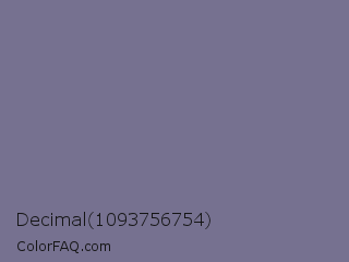 Decimal 1093756754 Color is a normal indigo color and the nearest color is Rhythm #777696. Hex code #767190 and RGB value is rgb(118,113,144). In RGB color space, this color is composed of 46% red, 44% green, 56% blue, In CMYK color space, this color is composed of 18% cyan, 22% magenta, 0% yellow , 44% black , In HSL color space, this color has a hue angle of 250° , 12% saturation and 50% lightness.