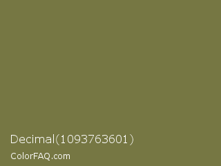 Decimal 1093763601 Color is a normal yellow color and the nearest color is Go Ben #726d4e. Hex code #767743 and RGB value is rgb(118,119,67). In RGB color space, this color is composed of 46% red, 47% green, 26% blue, In CMYK color space, this color is composed of 1% cyan, 0% magenta, 44% yellow , 53% black , In HSL color space, this color has a hue angle of 61° , 28% saturation and 36% lightness.