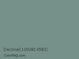 Decimal 1093814583 Color is a normal green color and the nearest color is Blue Smoke #748881. Hex code #769189 and RGB value is rgb(118,145,137). In RGB color space, this color is composed of 46% red, 57% green, 54% blue, In CMYK color space, this color is composed of 19% cyan, 0% magenta, 6% yellow , 43% black , In HSL color space, this color has a hue angle of 162° , 11% saturation and 52% lightness.
