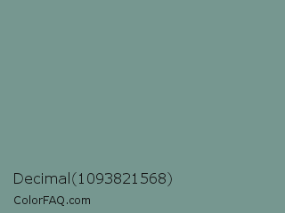 Decimal 1093821568 Color is a normal cyan color and the nearest color is Juniper #6d9292. Hex code #769790 and RGB value is rgb(118,151,144). In RGB color space, this color is composed of 46% red, 59% green, 56% blue, In CMYK color space, this color is composed of 22% cyan, 0% magenta, 5% yellow , 41% black , In HSL color space, this color has a hue angle of 167° , 14% saturation and 53% lightness.
