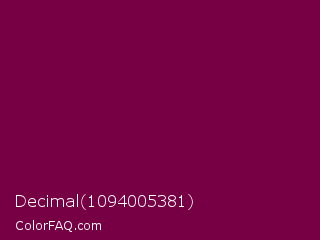 Decimal 1094005381 Color is a dark magenta color and the nearest color is Siren #7a013a. Hex code #770045 and RGB value is rgb(119,0,69). In RGB color space, this color is composed of 47% red, 0% green, 27% blue, In CMYK color space, this color is composed of 0% cyan, 100% magenta, 42% yellow , 53% black , In HSL color space, this color has a hue angle of 325° , 100% saturation and 23% lightness.