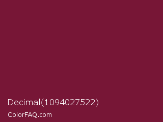 Decimal 1094027522 Color is a dark rose color and the nearest color is Claret #7f1734. Hex code #771636 and RGB value is rgb(119,22,54). In RGB color space, this color is composed of 47% red, 9% green, 21% blue, In CMYK color space, this color is composed of 0% cyan, 82% magenta, 55% yellow , 53% black , In HSL color space, this color has a hue angle of 340° , 69% saturation and 28% lightness.