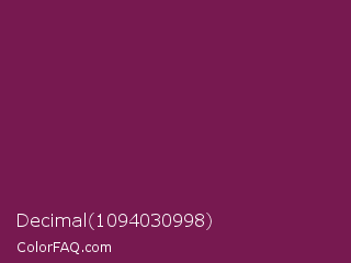 Decimal 1094030998 Color is a dark magenta color and the nearest color is Pansy Purple #78184a. Hex code #771950 and RGB value is rgb(119,25,80). In RGB color space, this color is composed of 47% red, 10% green, 31% blue, In CMYK color space, this color is composed of 0% cyan, 79% magenta, 33% yellow , 53% black , In HSL color space, this color has a hue angle of 325° , 65% saturation and 28% lightness.