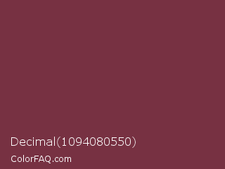 Decimal 1094080550 Color is a normal red color and the nearest color is Catawba #703642. Hex code #773142 and RGB value is rgb(119,49,66). In RGB color space, this color is composed of 47% red, 19% green, 26% blue, In CMYK color space, this color is composed of 0% cyan, 59% magenta, 45% yellow , 53% black , In HSL color space, this color has a hue angle of 345° , 42% saturation and 33% lightness.