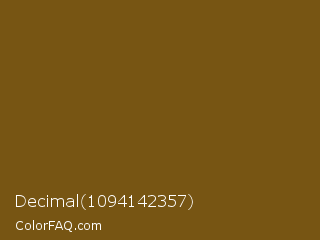 Decimal 1094142357 Color is a dark orange color and the nearest color is Raw Umber #734a12. Hex code #775513 and RGB value is rgb(119,85,19). In RGB color space, this color is composed of 47% red, 33% green, 7% blue, In CMYK color space, this color is composed of 0% cyan, 29% magenta, 84% yellow , 53% black , In HSL color space, this color has a hue angle of 40° , 72% saturation and 27% lightness.