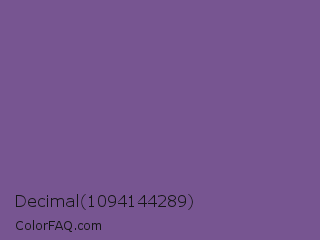 Decimal 1094144289 Color is a normal purple color and the nearest color is Dark Lavender #734f96. Hex code #775591 and RGB value is rgb(119,85,145). In RGB color space, this color is composed of 47% red, 33% green, 57% blue, In CMYK color space, this color is composed of 18% cyan, 41% magenta, 0% yellow , 43% black , In HSL color space, this color has a hue angle of 274° , 26% saturation and 45% lightness.