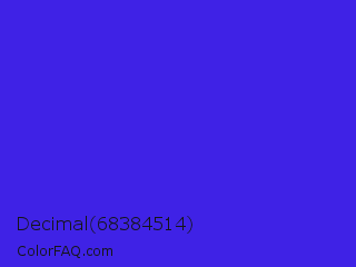 Decimal 68384514 Color is a normal indigo color and the nearest color is Han Purple #5218fa. Hex code #3f22e6 and RGB value is rgb(63,34,230). In RGB color space, this color is composed of 25% red, 13% green, 90% blue, In CMYK color space, this color is composed of 73% cyan, 85% magenta, 0% yellow , 10% black , In HSL color space, this color has a hue angle of 249° , 80% saturation and 52% lightness.