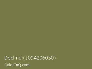 Decimal 1094206050 Color is a normal yellow color and the nearest color is Go Ben #726d4e. Hex code #777946 and RGB value is rgb(119,121,70). In RGB color space, this color is composed of 47% red, 47% green, 27% blue, In CMYK color space, this color is composed of 2% cyan, 0% magenta, 42% yellow , 53% black , In HSL color space, this color has a hue angle of 62° , 27% saturation and 37% lightness.