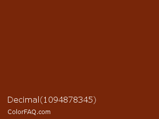 Decimal 1094878345 Color is a dark orange color and the nearest color is Kenyan Copper #7c1c05. Hex code #782609 and RGB value is rgb(120,38,9). In RGB color space, this color is composed of 47% red, 15% green, 4% blue, In CMYK color space, this color is composed of 0% cyan, 68% magenta, 93% yellow , 53% black , In HSL color space, this color has a hue angle of 16° , 86% saturation and 25% lightness.