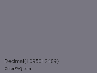 Decimal 1095012489 Color is a normal indigo color and the nearest color is Jumbo #7c7b82. Hex code #787681 and RGB value is rgb(120,118,129). In RGB color space, this color is composed of 47% red, 46% green, 51% blue, In CMYK color space, this color is composed of 7% cyan, 9% magenta, 0% yellow , 49% black , In HSL color space, this color has a hue angle of 251° , 4% saturation and 48% lightness.